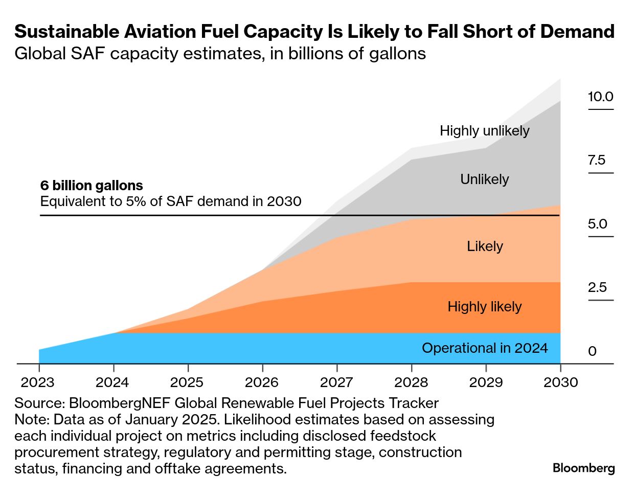 But that assumes there’s enough SAF to meet the quota. Around the world, manufacturers have struggled to get off the ground. Clean energy researcher BloombergNEF estimates that by 2030 there’ll be enough capacity to meet about 5% of global jet fuel demand. Countries, including Brazil, Japan, South Korea and Indonesia are also planning to introduce SAF mandates, which would put further pressure on supply.