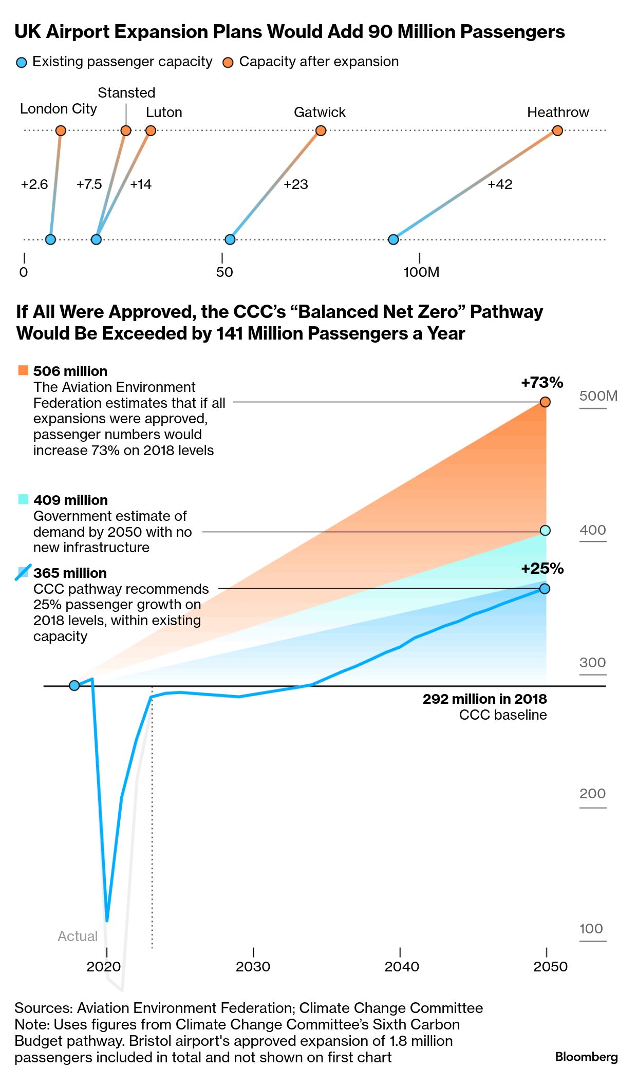 Growing emissions from aviation would put pressure on the other pillars of the UK’s net zero strategy. The government is aiming for 100% “clean” power — mostly from renewable sources — by 2030. One analysis, from Alex Chapman at the New Economics Foundation think tank, projects that expansions at Heathrow, Gatwick and Luton would cancel out the carbon benefits of the clean power plan within five years of the expansion taking place. The runway isn’t expected to be built and operational until 2035.